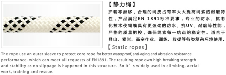 護(hù)套零滑移,合理的繩皮占有率大大提高繩索的耐磨特性,產(chǎn)品滿足EN1891標(biāo)準(zhǔn)要求,專業(yè)的防水,抗老化技術(shù)使繩纜具有更強(qiáng)勁的防水、抗UV,耐磨等性能,嚴(yán)格的質(zhì)量把控,確保繩索每一個結(jié)點的穩(wěn)定性。適合于登山、攀巖、高空作業(yè)、訓(xùn)練、救援等各類復(fù)雜環(huán)境使用。