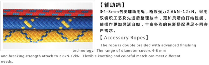 φ4mm-8mm,各種輔助用繩,破裂強(qiáng)力2.6KN-12KN,采用雙編織工藝及先進(jìn)后整理技術(shù),更加靈活的打結(jié)性能,使操作更加靈活自如,豐富多彩的色彩搭配滿足不同客戶需求。