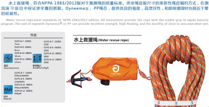革新性繩皮編織方式,在激流演習(xí)項目中保證更牢靠的抓握。質(zhì)量輕便,可漂浮于水面,繩體用鮮艷的橘紅色或橘黃色亮色系為主,具有反光和夜光功能,在危險時刻容易辨識,為生命保駕護航??蛇x用丙綸、超高分子量聚乙烯等不同材料,通過先進的生產(chǎn)工藝實現(xiàn)繩索的高強度、易識別、可漂浮等。適用于水上訓(xùn)練、救援等領(lǐng)域。