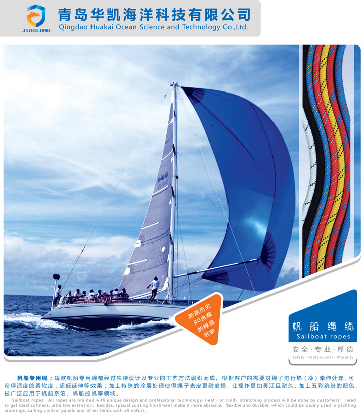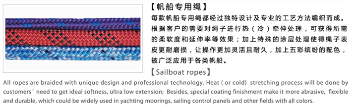 帆船專用繩:每款帆船用繩都經過獨特設計及專業(yè)的工藝方法編織而成,根據(jù)客戶的需要對繩子進行冷(熱)牽伸處理,可獲得所需的柔軟度和延伸率的效果;加上特殊的涂層處理使得繩子表面更耐磨損,讓操作更加靈活且耐久,加上五彩繽紛的配色,被廣泛應用于各類帆船。